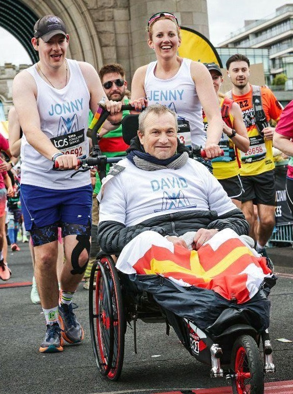 David has Inclusion Body Myositis, a progressive autoimmune disease for which there is no known cause or cure. Affecting some 6,000 people in the UK, the disease causes chronic inflammation and wastage of the muscles. After talking to his family about what they could do to raise funds, they decided to enter the London Marathon with Jenny and Jonny pushing David around the 26.2 mile course in a running wheelchair.