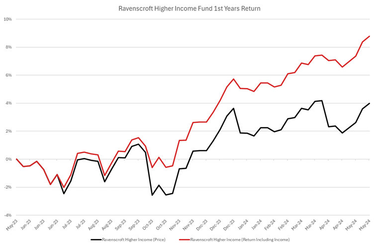 Last May we launched the Ravenscroft Higher Income Fund to allow investors to benefit from the significant value we saw in income assets following the turmoil in bond markets during 2022. We designed the Fund to capitalise on more than a decade’s worth of experience running the Ravenscroft Global Income Fund, combined with a broader mandate to help investors access the best income streams from the widest range of assets. As we arrive at the fund’s first birthday, we wanted to thank everyone who has entrusted us with their money and to report back on how the first year has gone. As you can see in the chart below the fund has returned 8.8% (including income and capital gains1) which we are very pleased with.