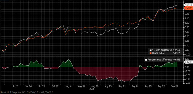 This systematic flow has been a major driver of returns since Liberation Day. While the AI investment boom dominated headlines, the breadth of participation across sectors pointed to a more resilient and broad-based rally, underpinned by stronger-than-expected GDP data and robust corporate earnings. Through July and August, Global Blue Chip’s earnings scorecard had a look of respectability about it, with some 80% of holdings beating revenue estimates, >65% beating on earnings per share (“EPS”), and 70% receiving earnings upgrades from analysts. With that said, we still incurred some of that trademark volatility – see the period of underperformance in the chart during earnings season (from mid-July to the end of August) largely driven by a ‘sell the fact’ reaction to what were, on the whole, very good earnings results.