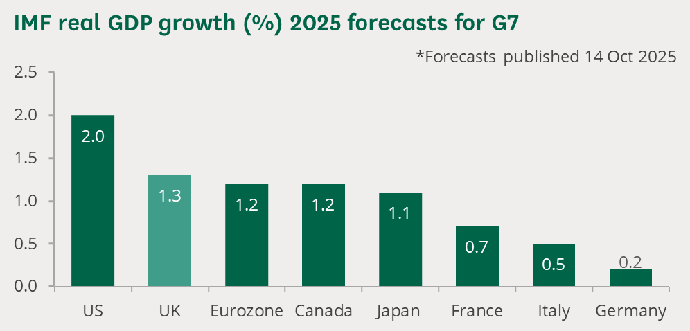 The US Federal Reserve (“Fed”) will next meet on 29th October, and markets are expecting another 25-basis point cut. At the moment, in the US it appears that the weakening jobs market is the main concern over inflation fears. This is probably sufficient for the Fed to act in October and perhaps in December, but the outlook for 2026 is less clear. Whilst the US jobs market is giving cause for concern, the economy is proving reasonably resilient. To go back to the graph above, the US is forecast to be the best performing of the G7 countries this year. It could, therefore, be that ultimately market expectations of further cuts in bank rates in 2026 are curtailed by a combination of resilient economic growth and above-target inflation.