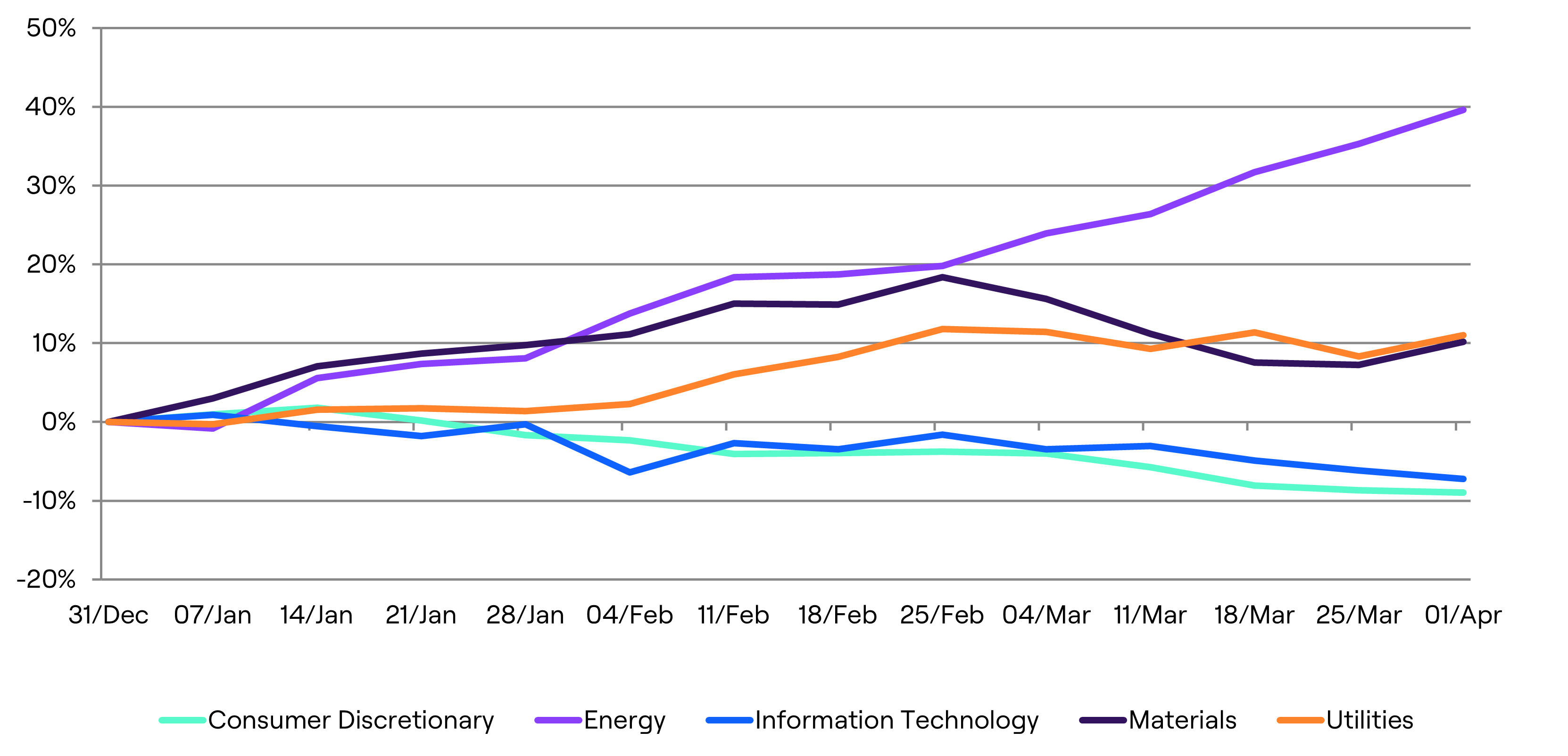 Continuing by sector (as charted below), energy was the clear standout, with global supermajors benefiting from rapidly rising oil prices. Similarly, materials benefited as investors sought exposure to physical commodities and minerals. Finally, the defensive nature of utilities came to the forefront and was boosted by increasing electricity demand required to power the ongoing expansion of AI data centres. Conversely, the sectors that dominated 2025 faced a valuation reset, predominately technology, which was heavily impacted as above. On the consumer side, discretionary struggled, considering rising energy prices and the impact this may have on household purchasing power, impacting major retailers and automotive manufacturers alike.