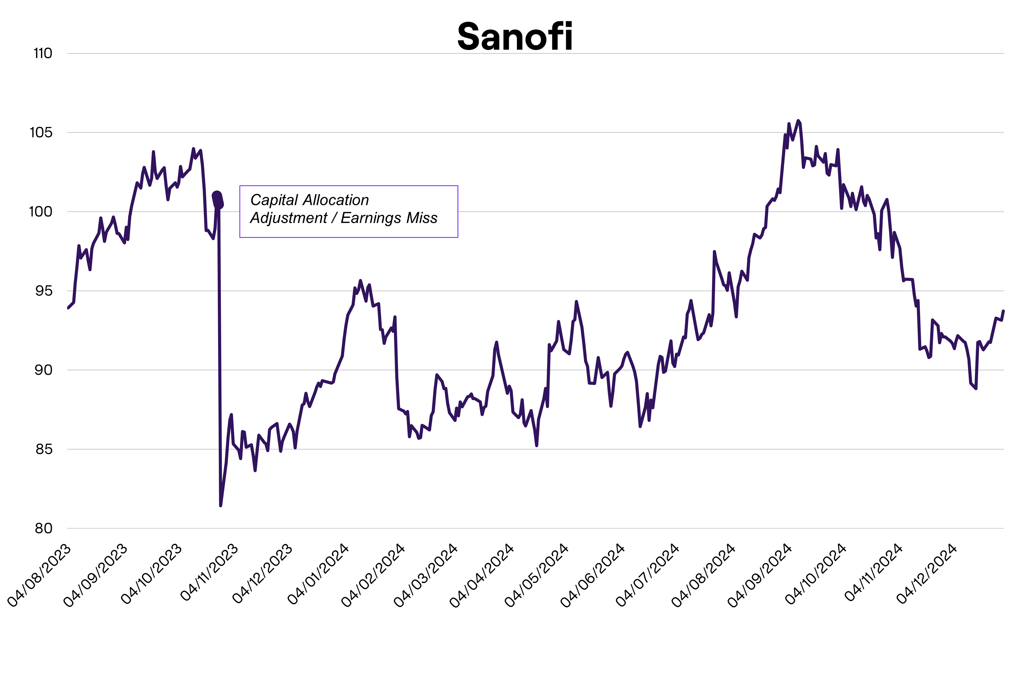 We experienced this first-hand in Sanofi’s Q3 2023 update. Heading into the announcement investors expected a continuation of mid-single-digit earnings growth, underpinned by strong uptake of the blockbuster drug, Dupixent, and a similar growth profile to be signposted for the year ahead. Instead, management marked earnings progress down to essentially flat as they accelerated investment into the pipeline to secure growth through the rest of the decade. We saw that as a sensible long-term reallocation of capital. The market’s response - down ~20% - suggested otherwise. A 5% position in what we considered a cheap, defensive pharmaceutical business translated into roughly a ~1% haircut to performance in a single day.